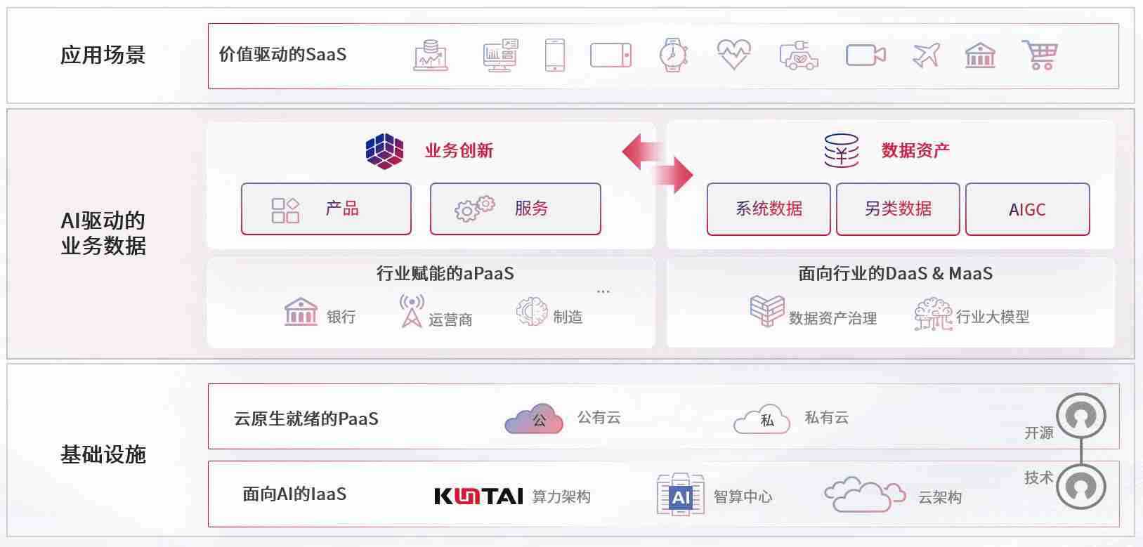 数字时代,,,围绕企业数字化转型的关键要素,,太阳成集团tyc151cc数码开创性的提出数云融合战略和技术体系框架,,,着力在云原生、、、数字原生、、、AI原生和信创产业上架构产品和服务能力,,,,为处在不同数字化转型阶段的快消零售、、汽车、、、、金融、、医疗、、政企、、、、教育、、、运营商等行业客户提供泛在的敏捷IT能力和融合的数据驱动能力,,,,构建跨界融合创新的数字业务场景和新业务模式,,,,助力企业级客户建立面向未来的核心能力和竞争优势,,全面推动社会的数字化、、、智能化转型升级。。。。