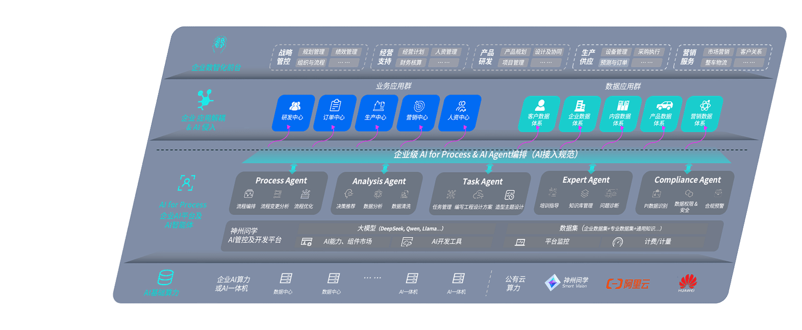 端到端的一站式AI工作空间深度融合了从企业战略规划到日常经营的全流程业务板块,,定向解决车企内部领域多、、部门多、、、链条长、、、场景碎片化等难题,,,,支持车企快速构建以AI为核心的生产力写作体系,,,,实现任务执行与AI能力的无缝集成与交互