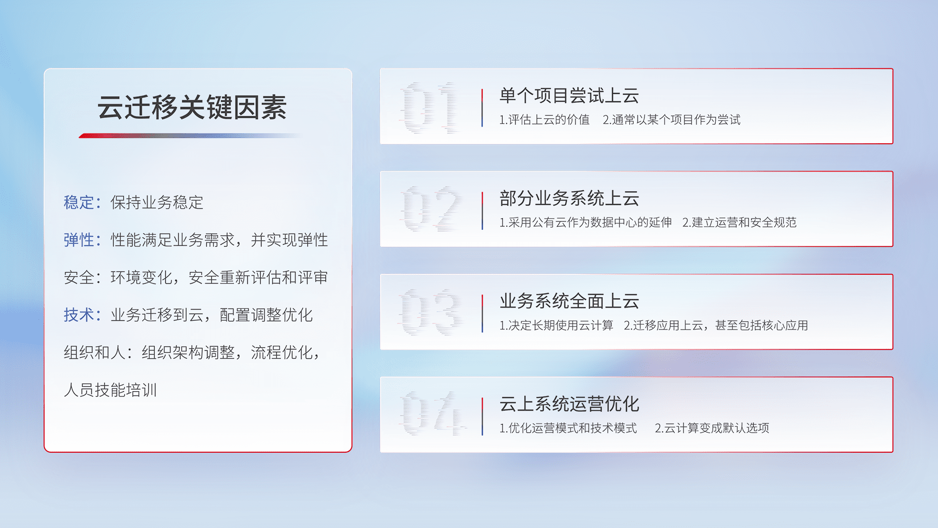 结合实际业务,,,,从规划设计、、、云平台选型、、云原生改造、、数据迁移、、、、集成交付,,,,迁移全过程为客户识别最佳上云路径,,,做好风险识别管理,,设计网络架构、、身份权限、、安全审计合规、、、操作审计、、、、日志审计、、、监控告警策略、、、多站点容灾设计等,,,对云上基础设施进行整体规划,,提升IT治理水平,,以满足弹性、、、、高可用、、、高性能的需求。。。